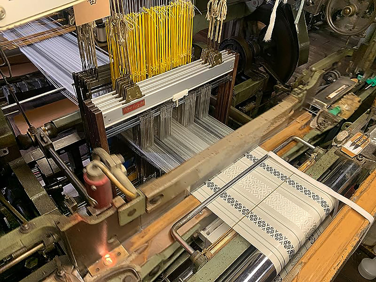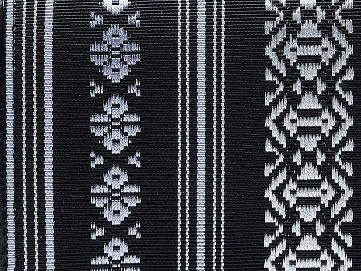 たくさんの経糸 (たていと) に数本の糸をまとめ合わせた緯糸 (よこいと) を強く打ち込んでつくられる、コシのある丈夫な生地が特徴です。